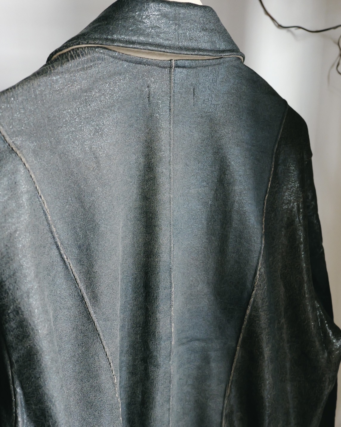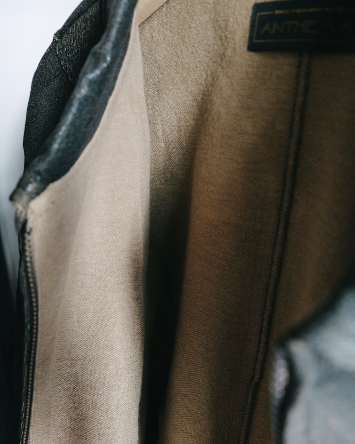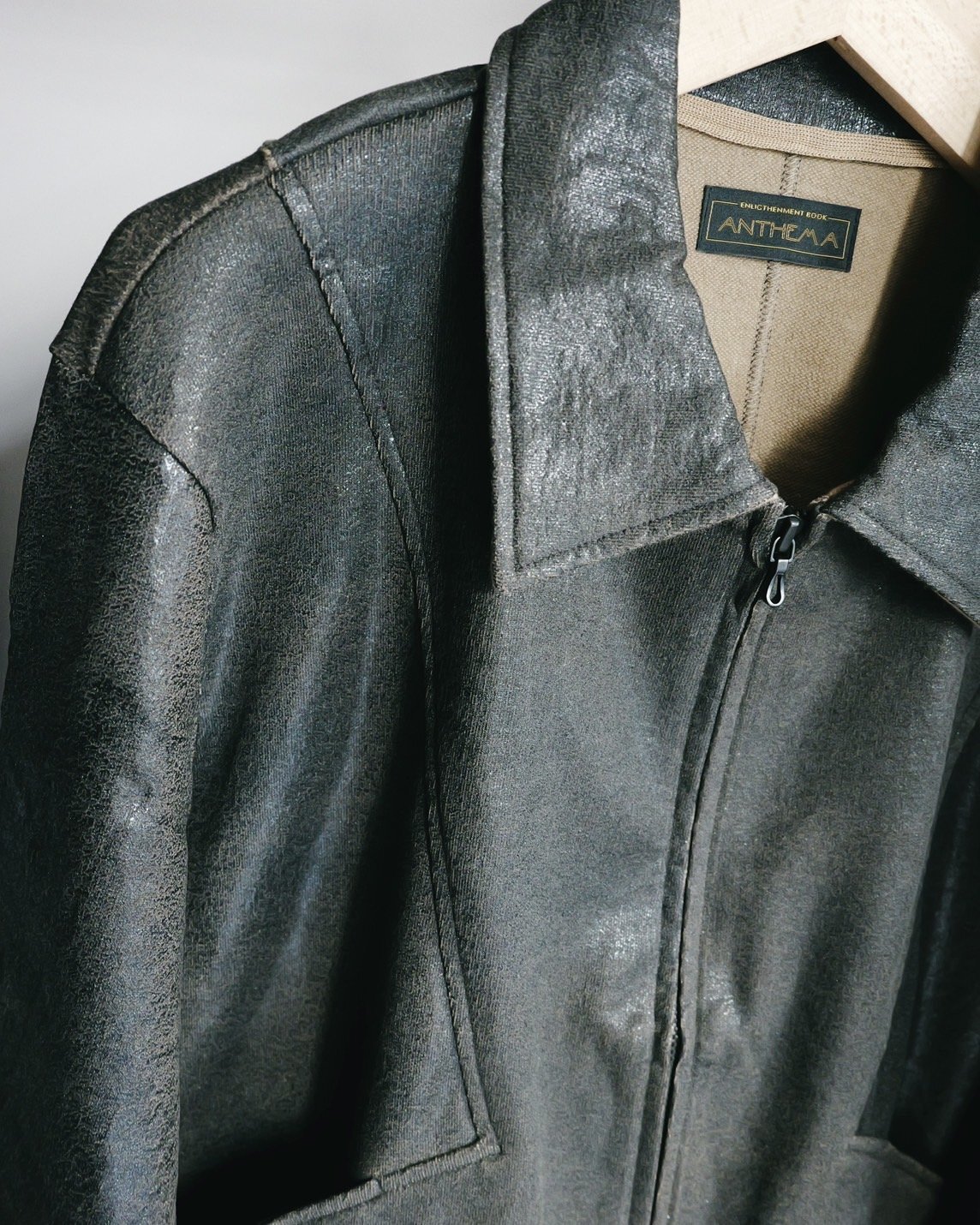 ANTHEM Aならではのひび割れたレザーの様なクラック加工は、素材をガチガチに固めず、一つ一つ手作業で行うことで、ひび割れのムラ感などを繊細に表現しています。