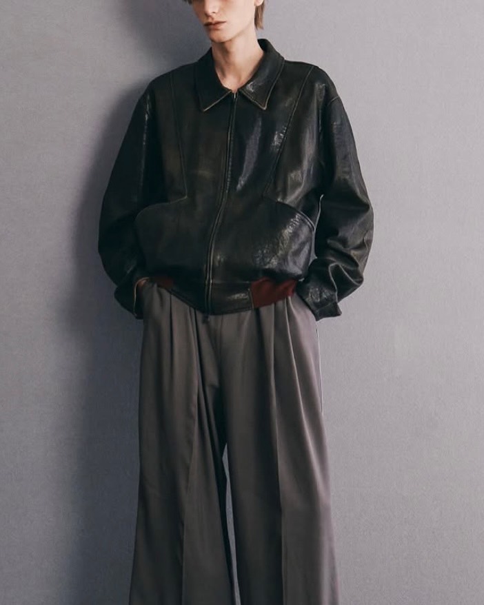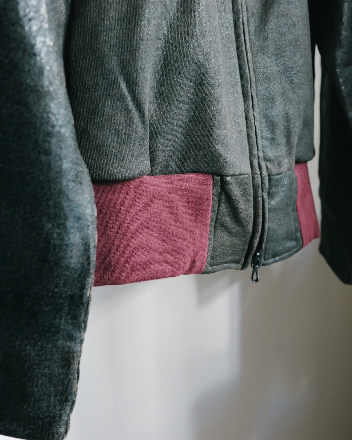 70年代のレザージャケットにグリズリージャケットのディテールを掛け合わせたスウェットブルゾンは、裾でブラウジングさせて着用する短めの着丈設定にしています。