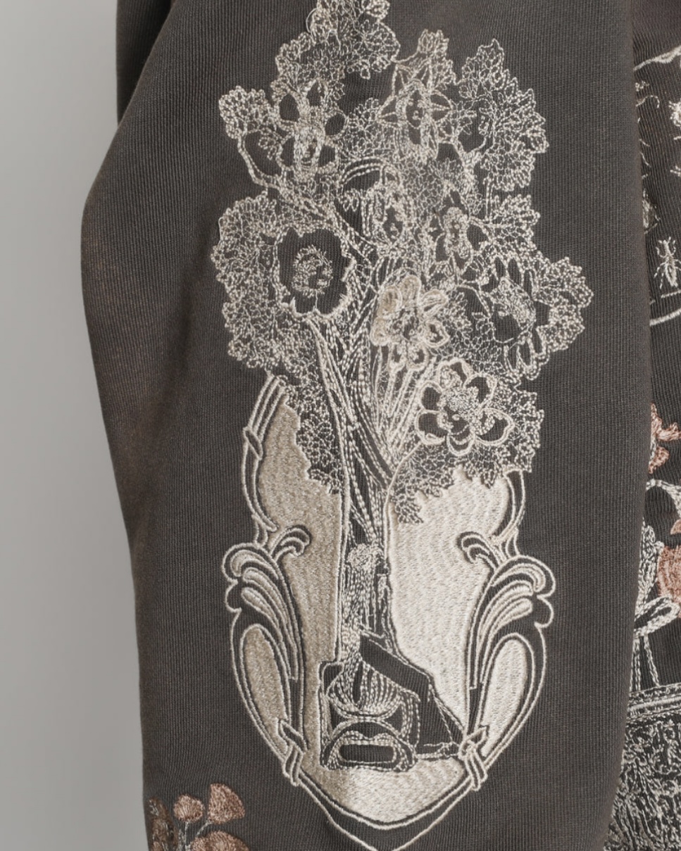 “時の庭”をテーマにした刺繍が、ロムコラージュと呼ばれるアート技法や連作的な描写を用いながら全面に描かれています。