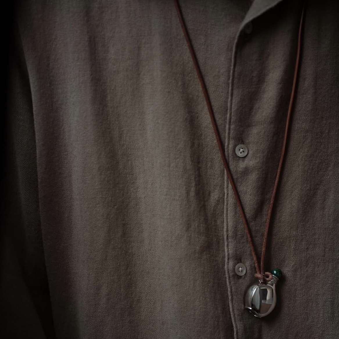こちらは鋳造ではなく1つ1つ手作業で形作られた銀のボトルに、シルバーや天然石のキャップをお選びいただき、別売りのレザーストラップを付けてネックレスとしてお使いいただけます。