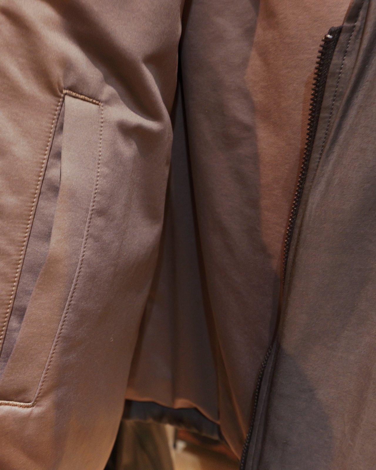 素材にはオリジナルのナイロンレーヨンポプリンを使用。染料で下地を染めた上に顔料でオーバーダイすることで、顔料染めでは表現できない色味の複雑さや程よいスレやムラ感が感じられます。